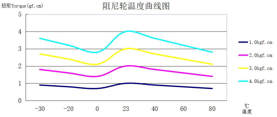 The torque of the damper (speed: 20r/min) changes with changes in ambient temperature. Typically, torque increases at lower temperatures and decreases at higher temperatures, as shown in the graph above |