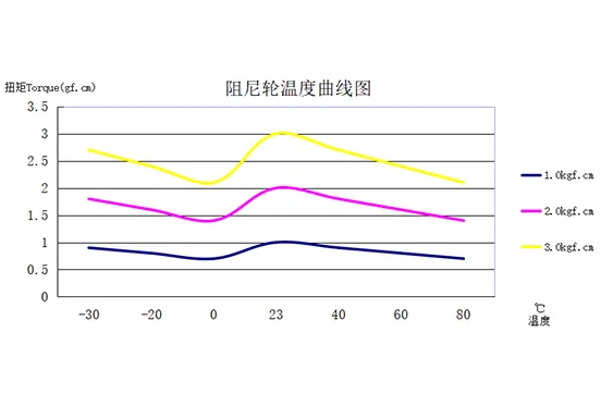 The torque of the damper (speed: 20r/min) changes with changes in ambient temperature. Typically, torque increases at lower temperatures and decreases at higher temperatures, as shown in the graph above |