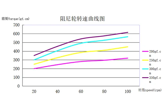Damper torque (23°C ambient temperature) changes with speed. Typically, torque increases with increasing rpm, as shown in the figure above |